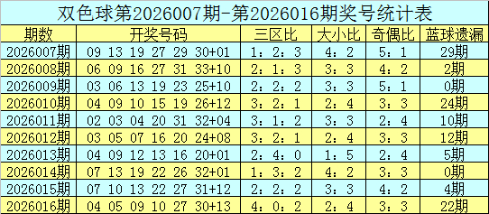 红球三区比推荐:最近3期红球三区比分别开出1:3:2、2:2:2、4:0:2,3期红球三区比总比例为7:5:6,本期预计红球三区平衡出号,关注三区比2:2:2。