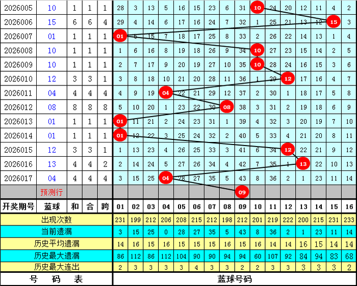 上期开奖:福彩双色球第2026017期奖号为:01 03 05 18 29 32 + 04,红球012路比为2:1:3,没有开出连码,开出1个重号:05。